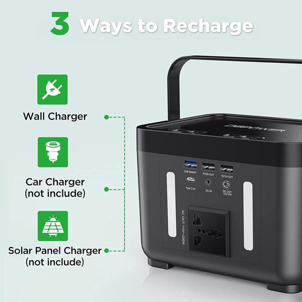 This power station supports being charged by solar panel( not included in the package); which brings you an easy and accessible way to charge the battery when you are out on a camping trip.