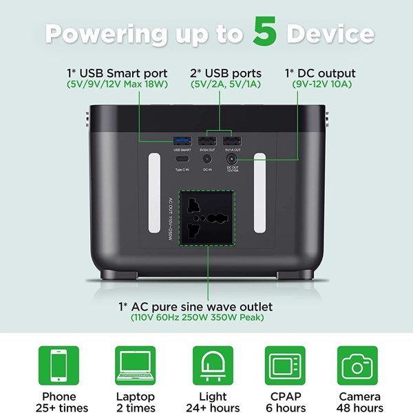 [ POWERING UP TO 5 DEVICES ] DBPOWER portable power station features with AC/DC/USB outputs: 1* AC outlet (110V 60Hz 250W 350W Peak); 1* DC output (9V-12V 10A); 2* USB ports (5V/2A; 5V/1A); 1* USB Smart port (5V/9V/12V Max 18W) can support quick charge. Our AC pure sine wave outlets can power many equipments such as smartphone; tablet; laptop; camera; light; drones; fans; in-car appliances.