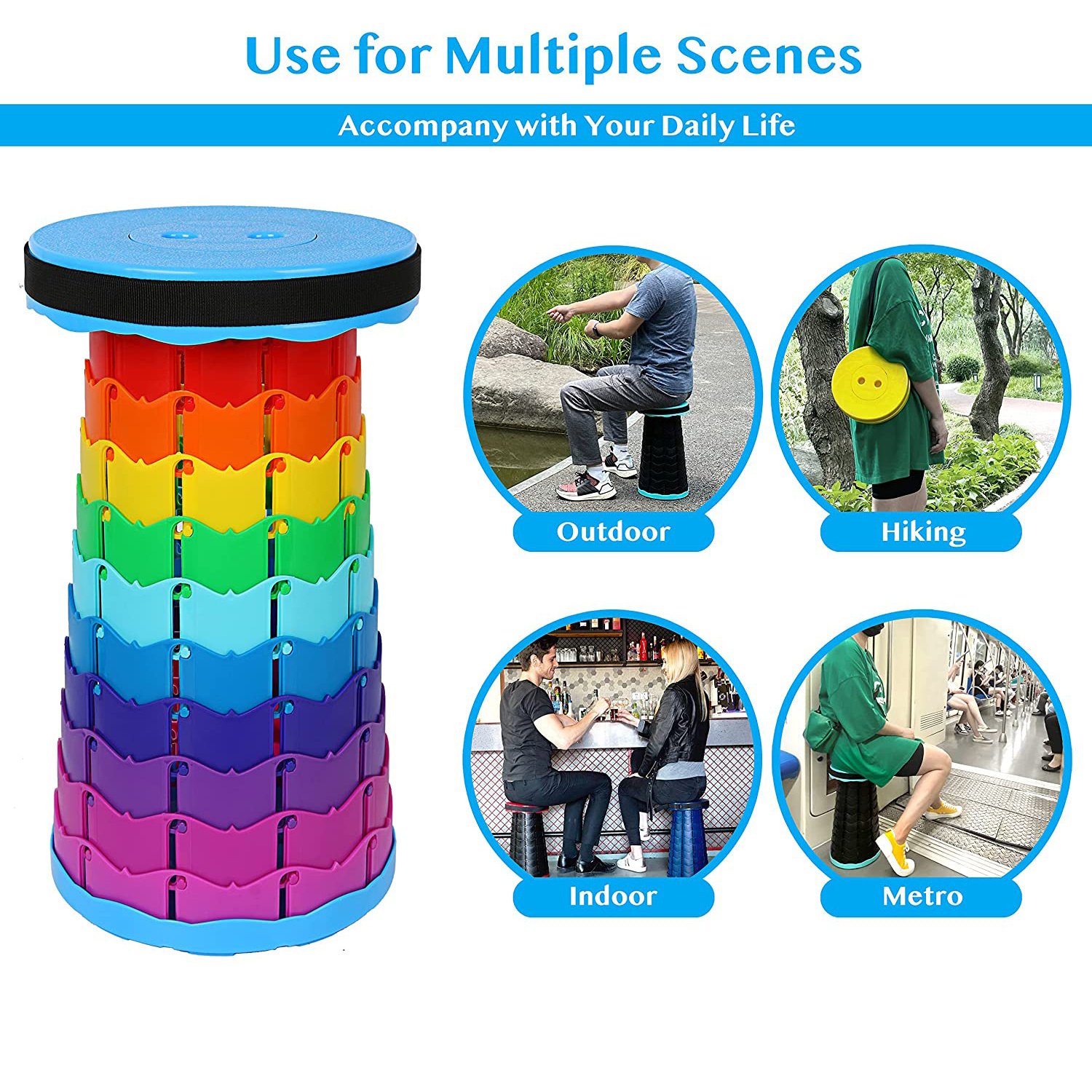 5.Widely Used: This portable telescopic stool is very suitable for indoor and outdoor use, such as kitchen, living room, bedroom, bathroom, office, camping, traveling, fishing, leisure, barbecue, picnic, hiking, queuing and even on the subway!