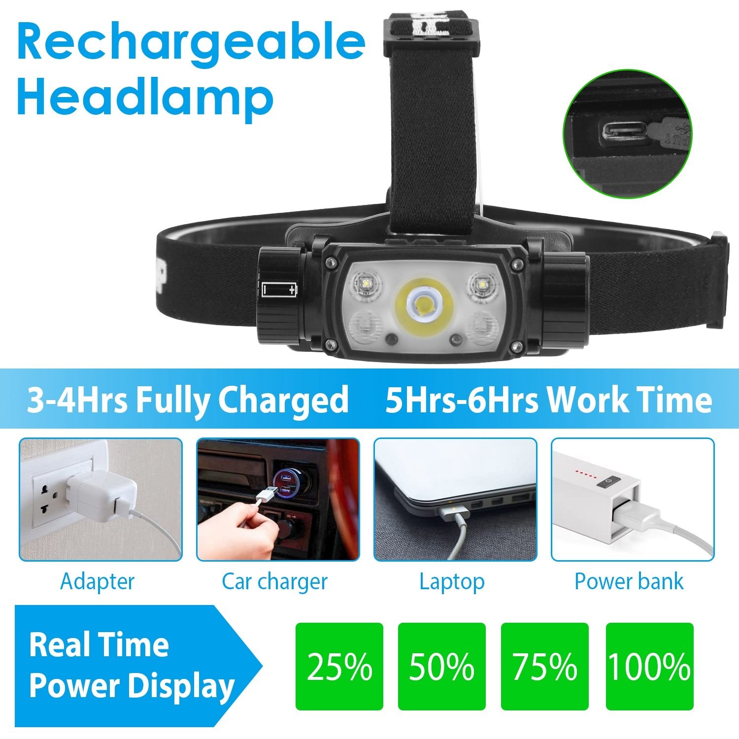 *Super Bright & Rechargeable Headlight*:Adopting premium light source with a maximum lighting distance of 656ft; it can easily light up a tent; tunnel; road; and etc.. The built-in lithium battery can work for 6hrs after being fully charged. You can charge it via any power supply with USB port.