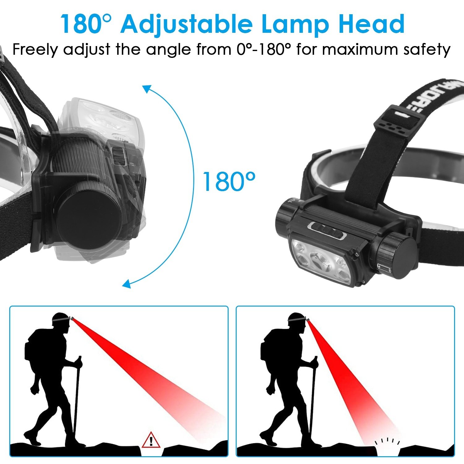 *9 Lighting Modes*:This headlamp is equipped with 9 light modes; including P50 high brightness white light; P50 low brightness white light; P50 strobe strong white light; 2Pcs XPE strong white light; 2Pcs steady on LED red light; 2Pcs flash LED red light; P50 hand wave high brightness white light; P50 hand wave low brightness white light; P50 hand wave strobe strong white light. Short pressing 3 button to cycle through various modes and meet your various needs. Besides; you can slide the lamp head 180° to adjust the lighting angle.